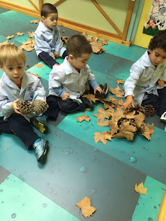 Recordeu que vam anar d'excursió al Parc de la Ciutat a recollir fulles?, doncs ara us ensenyarem que podem treballar amb elles. No us quedeu només amb el concepte més proper com que les fulles cauen dels arbres i això significa que estem a la tardor, a més es poden treballar conceptes de so i silenci, el so que fan les fulles al trapitjar-les, també vam treballar adalt i abaix, dins i fora i gran i petit que mitjançant aquesta activitat anem interioritzant aquests conceptes.
